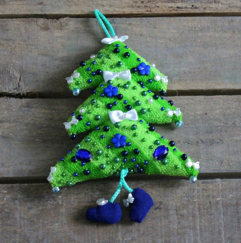 Елочки имеют петельку-подвеску, за которую ее можно подвесить на любой имеющийся в доме крючок или использовать в качестве елочной игрушки на большой новогодней елке.