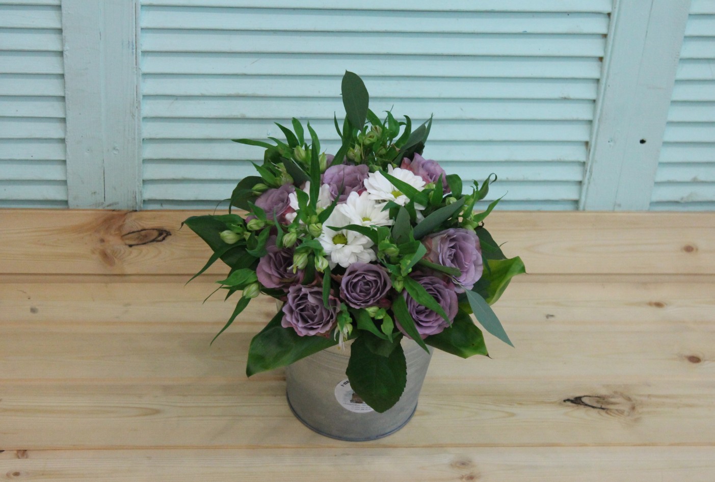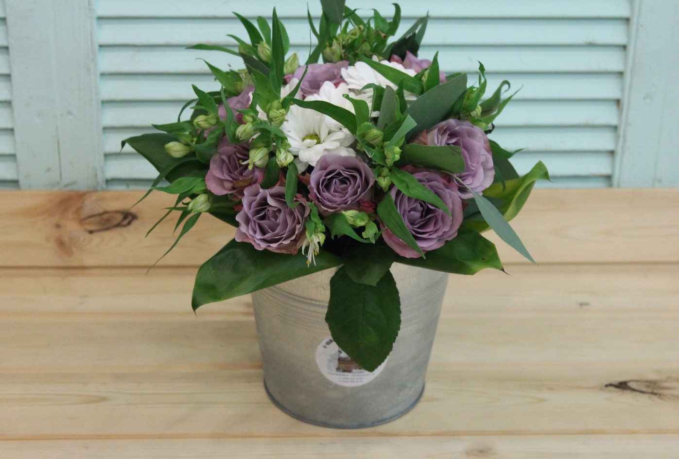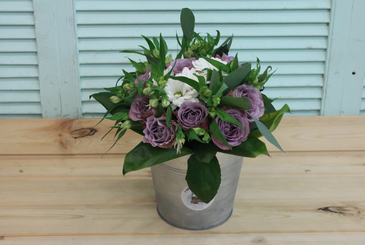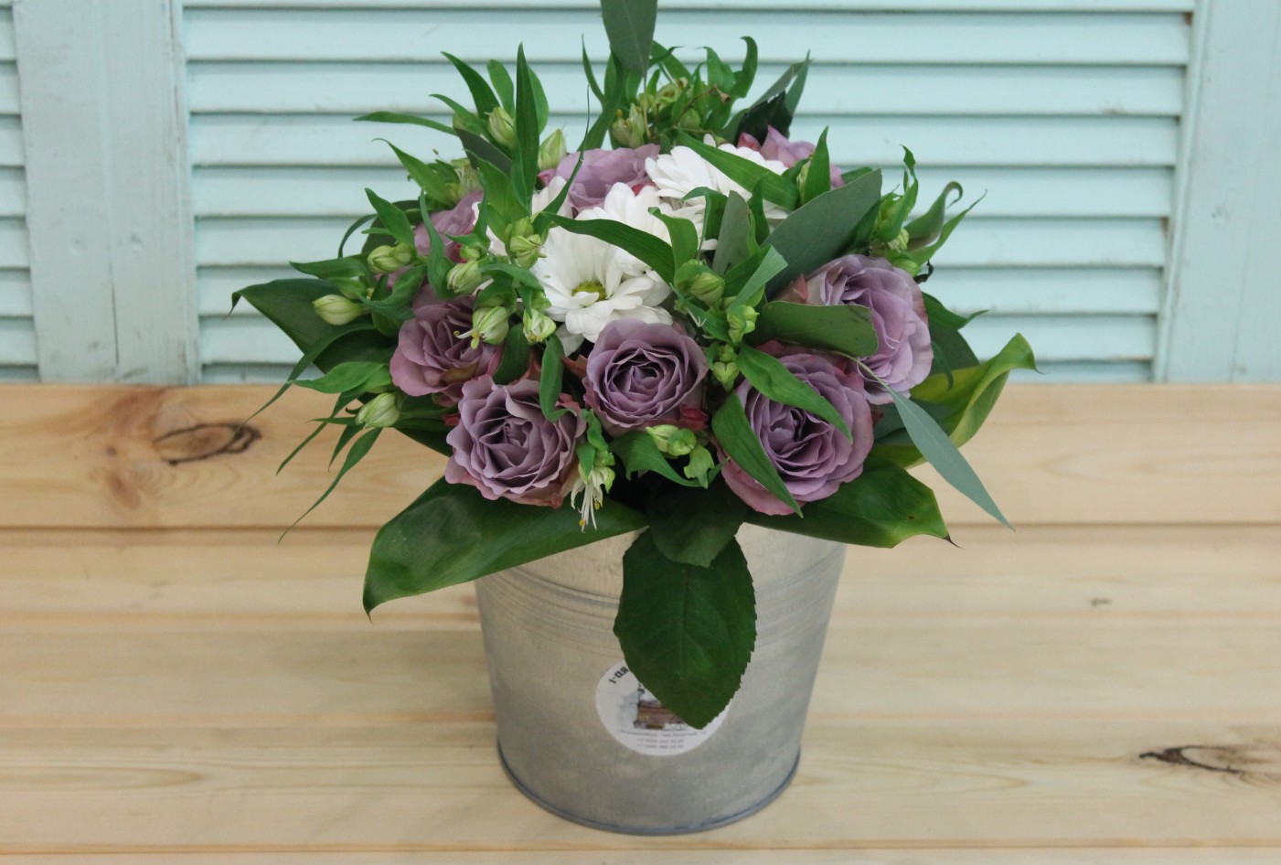 Фотосессия букета с сиреневыми розами в ведерке