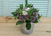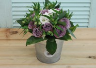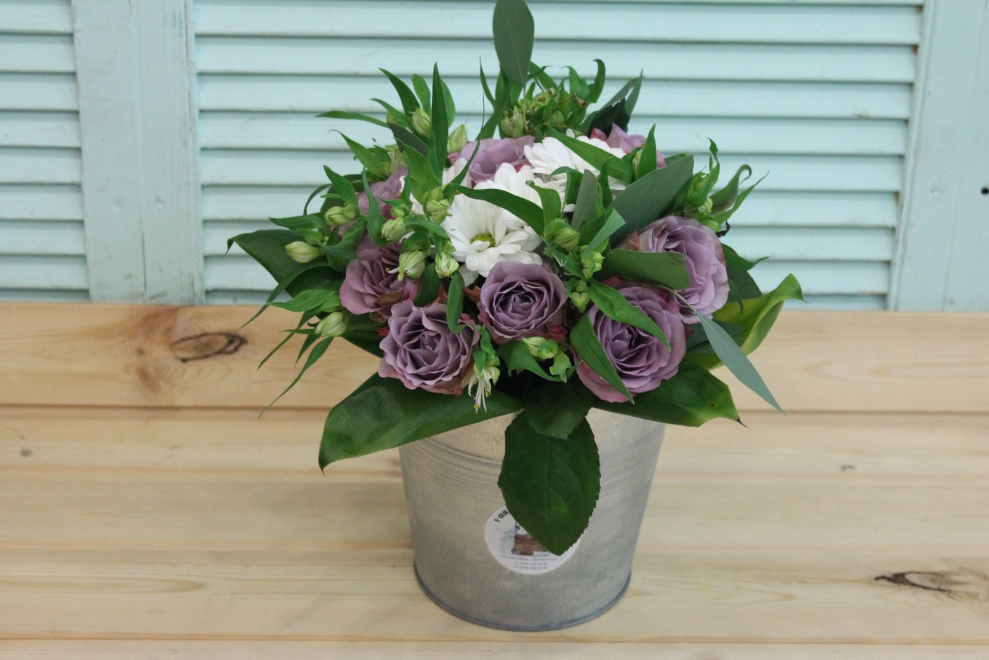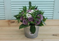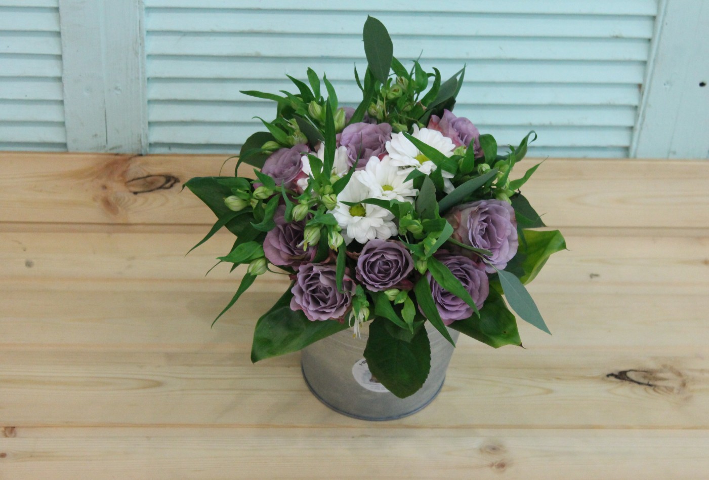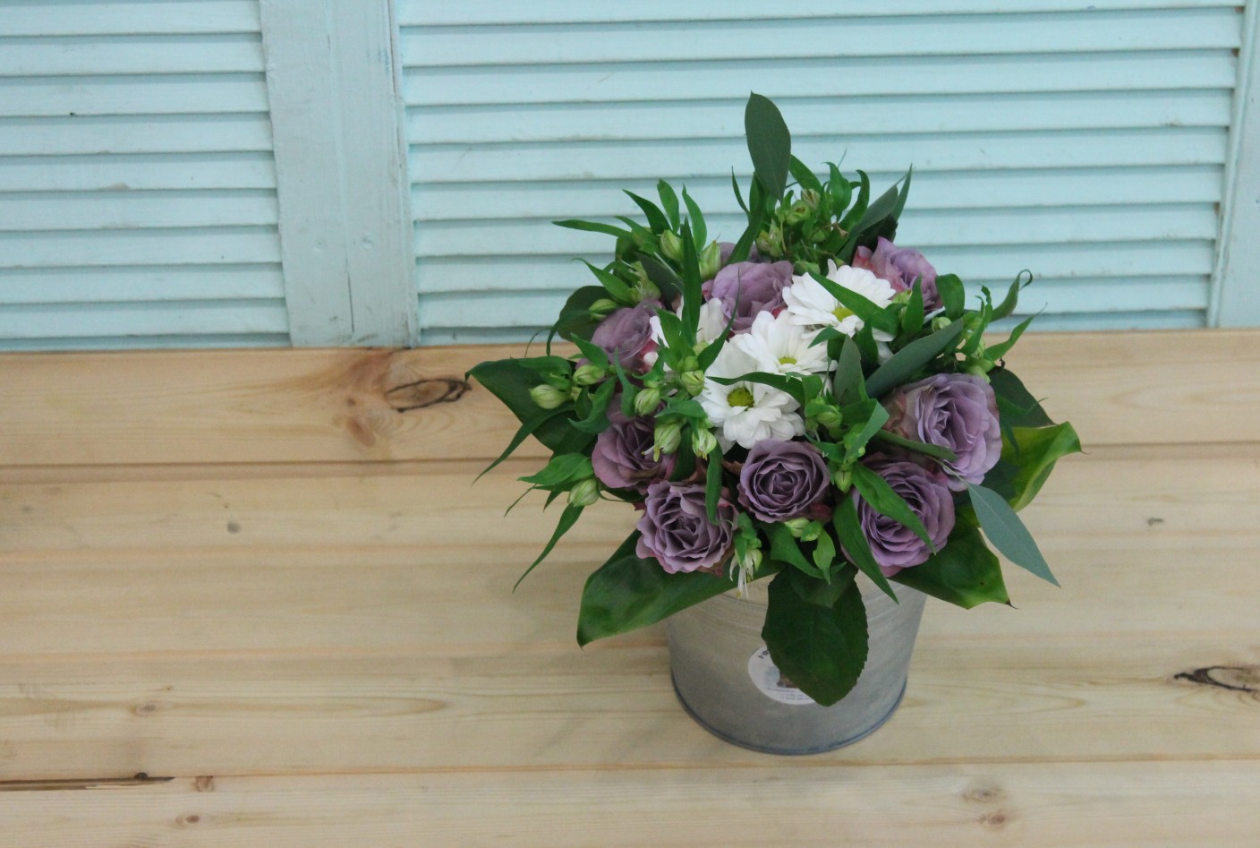 Фотосессия букета с сиреневыми розами в ведерке