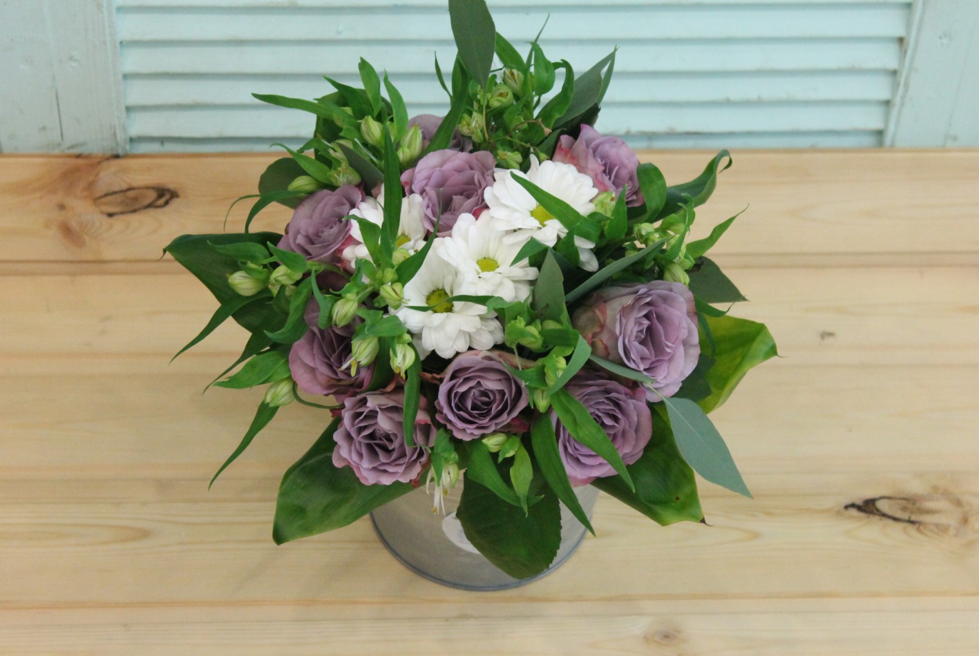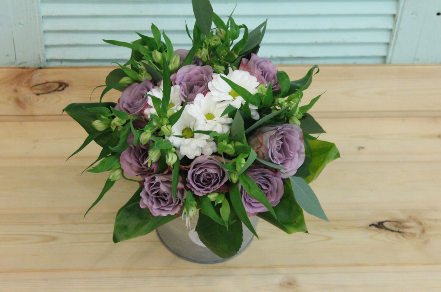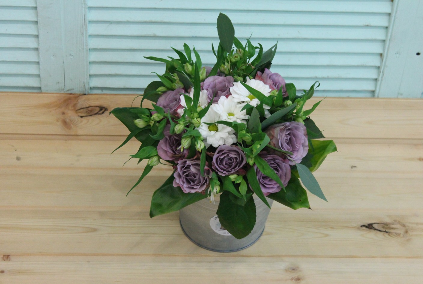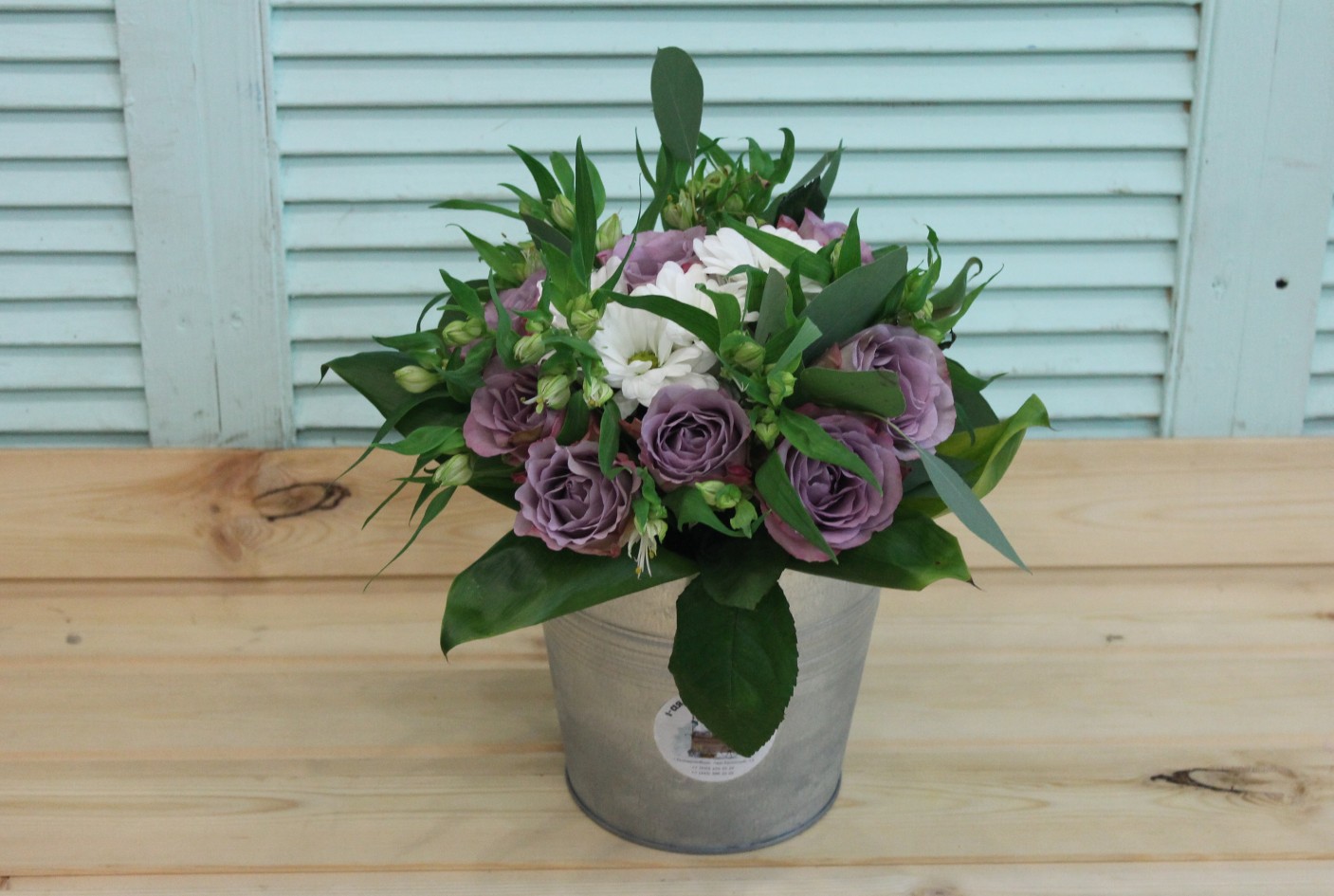 Фотосессия букета с сиреневыми розами в ведерке