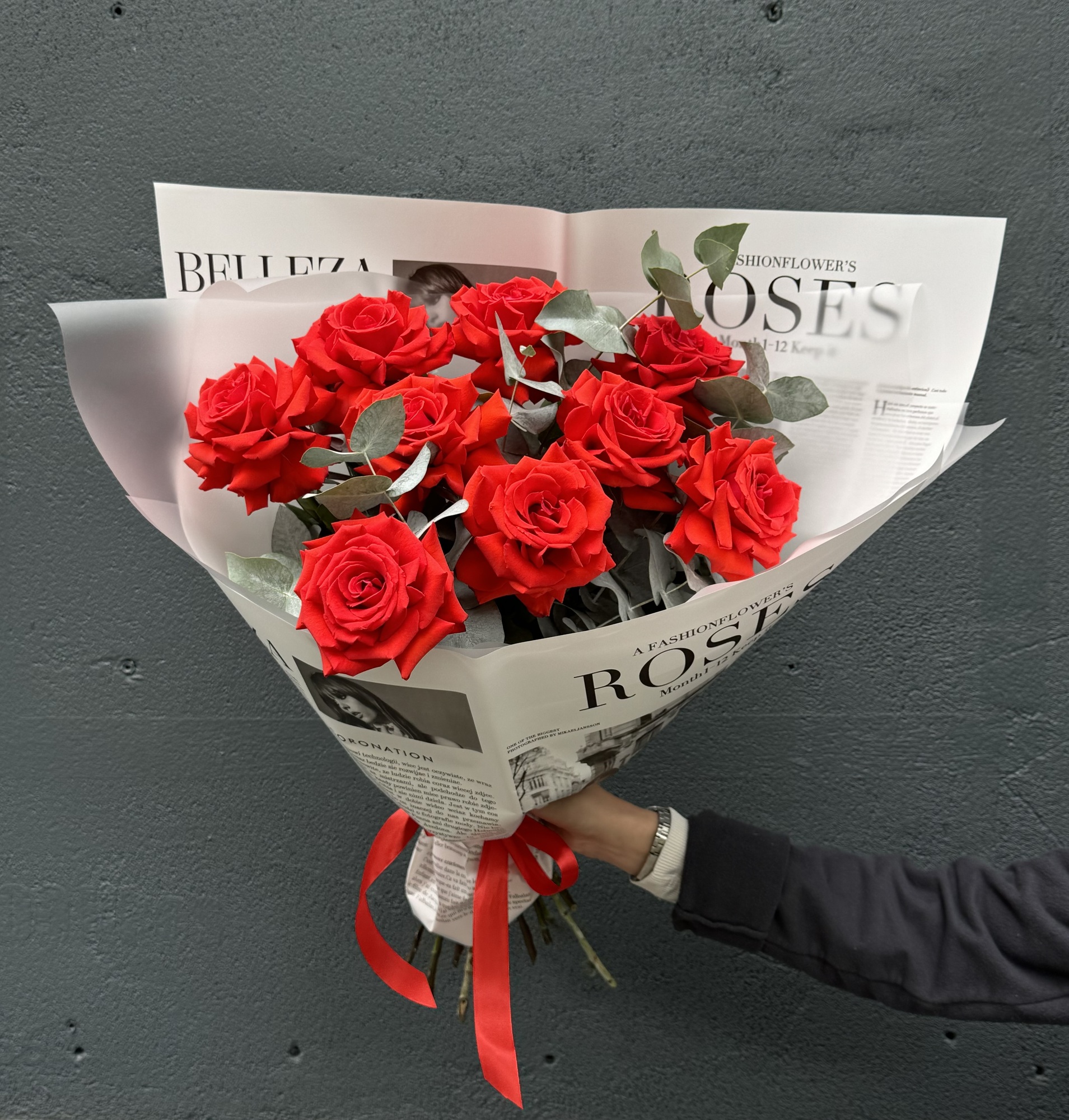 Букет из 9 роз с эвкалиптом