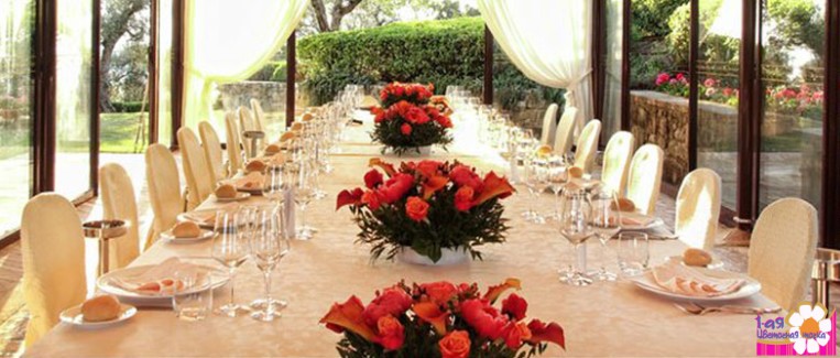 Оформление свадебного стола композициями из оранжевых цветов