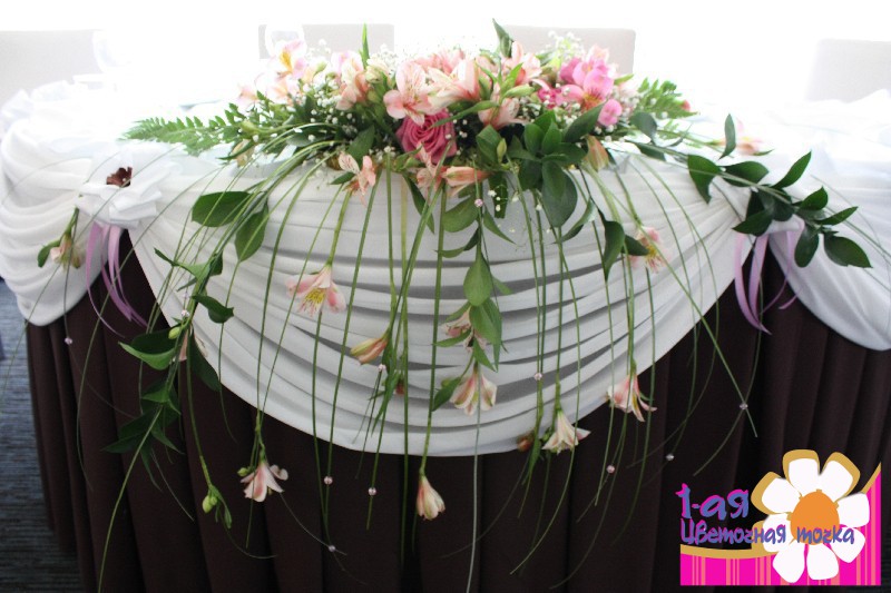Часто молодожены представляют себе только красивый центральный стол с праздничной сервировкой и цветочным декором. Все пространство свадебного банкета или зала для выездной регистрации не принимается во внимание при заказе флористического оформления. Поэтому иногда свадебный центральный стол доминирует над всем пространством. Он бывает перегружен декоративными элементами, временами становится похож на клумбу. Молодожены тратят достаточное существенные суммы на оформление одного стола. При этом общее впечатление от праздничного пространства остается далеким от настоящего свадебного праздника. Результатом такого подхода становятся не очень выразительные свадебные фотографии. Кроме того, иногда громоздкие композиции на столе молодоженов могут просто скрывать главных действующих лиц этого праздника от части гостей.