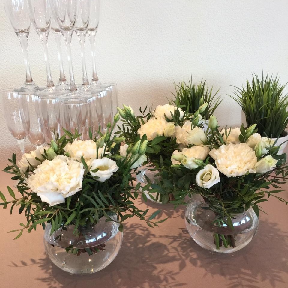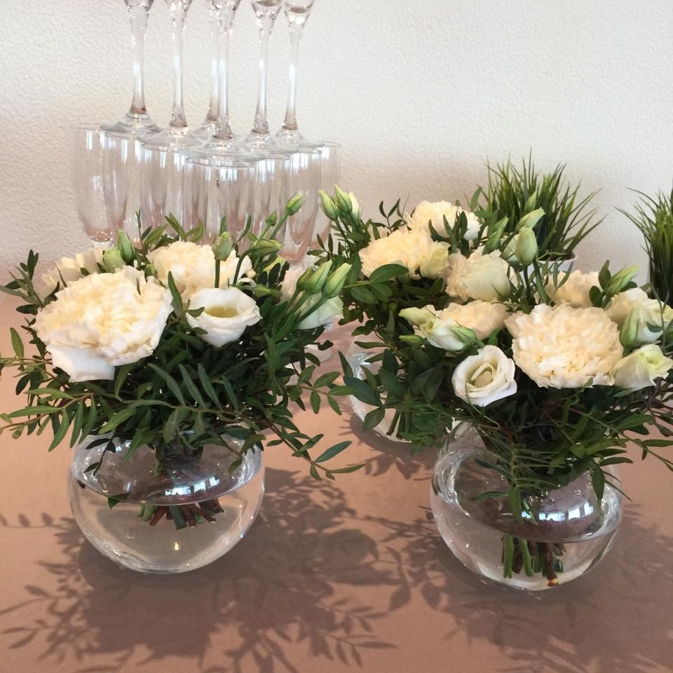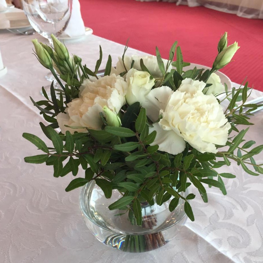 Главная / Главная / Свадебная флористика / Оформление свадебных залов / Композиция из белых цветов для украшения стола (без вазы)