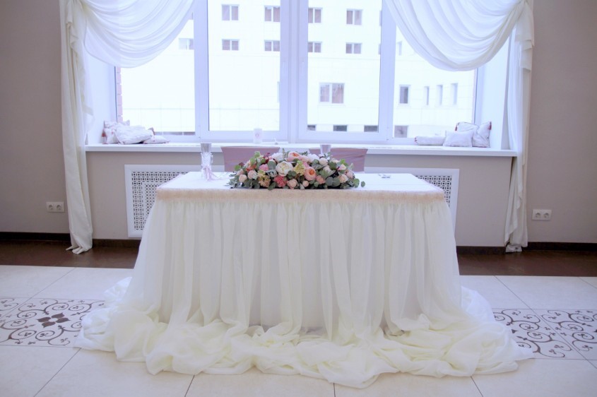 Часто молодожены представляют себе только красивый центральный стол с праздничной сервировкой и цветочным декором. Все пространство свадебного банкета или зала для выездной регистрации не принимается во внимание при заказе флористического оформления. Поэтому иногда свадебный центральный стол доминирует над всем пространством. Он бывает перегружен декоративными элементами, временами становится похож на клумбу. Молодожены тратят достаточное существенные суммы на оформление одного стола. При этом общее впечатление от праздничного пространства остается далеким от настоящего свадебного праздника. Результатом такого подхода становятся не очень выразительные свадебные фотографии. Кроме того, иногда громоздкие композиции на столе молодоженов могут просто скрывать главных действующих лиц этого праздника от части гостей.