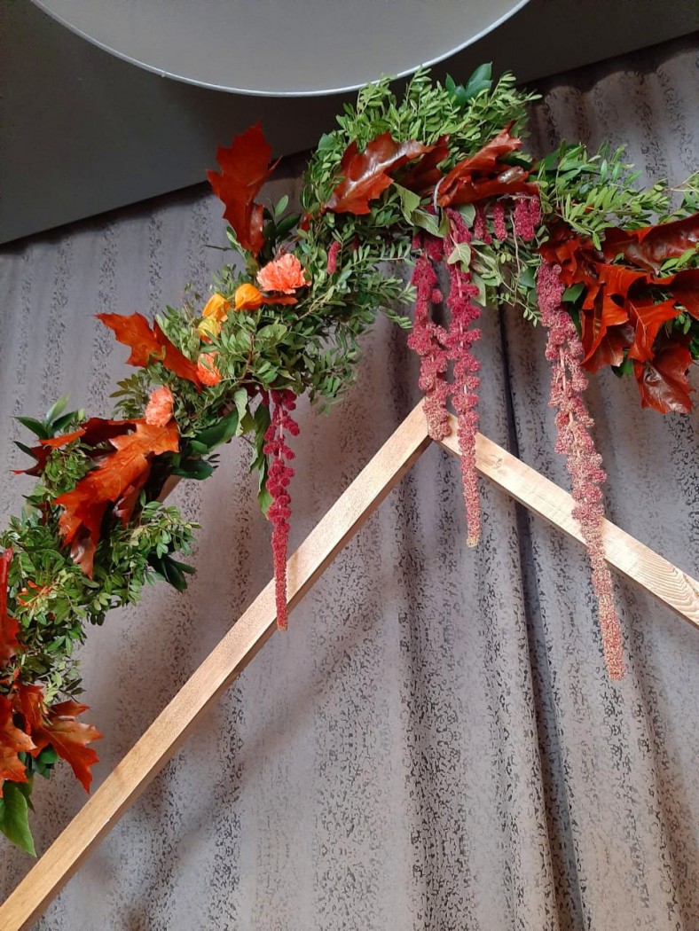 В составе оформления использовано несколько видов декоративной зелени, физалис, амарант, листья дуба или клена осенние, оранжевые диантусы.