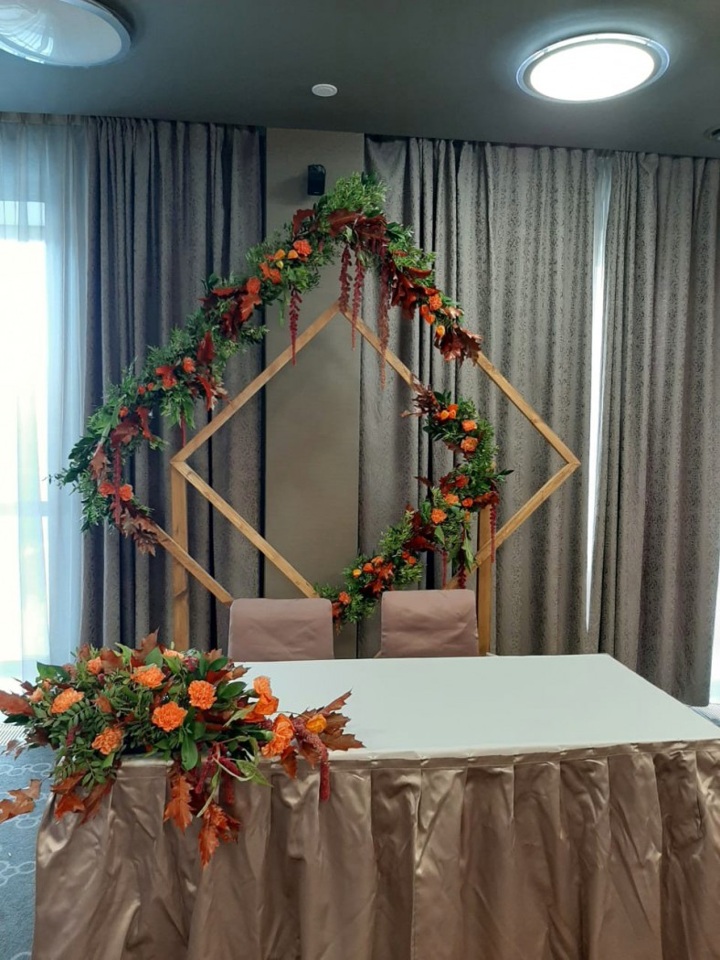 Часто молодожены представляют себе только красивый центральный стол с праздничной сервировкой и цветочным декором. Все пространство свадебного банкета или зала для выездной регистрации не принимается во внимание при заказе флористического оформления. Поэтому иногда свадебный центральный стол доминирует над всем пространством. Он бывает перегружен декоративными элементами, временами становится похож на клумбу. Молодожены тратят достаточное существенные суммы на оформление одного стола. При этом общее впечатление от праздничного пространства остается далеким от настоящего свадебного праздника. Результатом такого подхода становятся не очень выразительные свадебные фотографии. Кроме того, иногда громоздкие композиции на столе молодоженов могут просто скрывать главных действующих лиц этого праздника от части гостей.